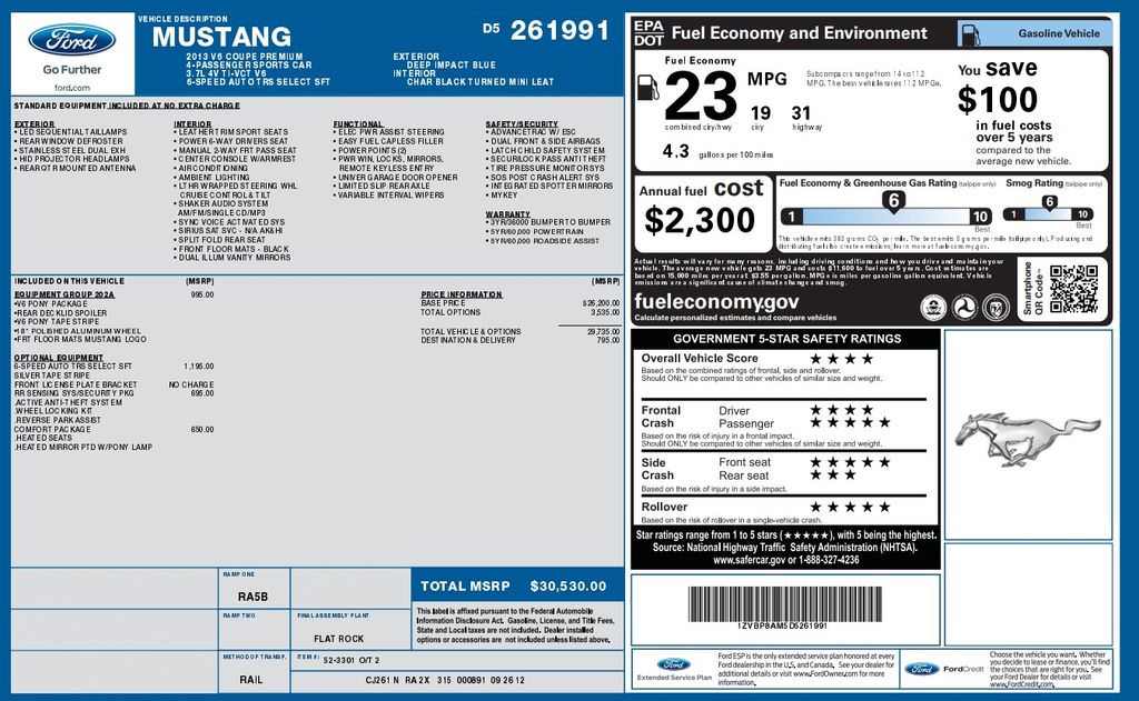 2013 Ford Mustang Premium Group 202A ($995 option) features a 3.7L 4V Ti-VCT V6 Engine with a 6 Sped Auto Transmission ($1,195 option), Security Package ($695 option) and a Comfort Package ($650 option)!